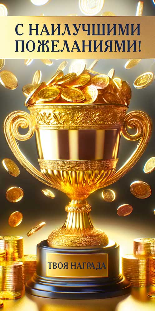 Конверт для денег формата евро изготовлен из плотного картона, что обеспечивает устойчивость изделия к деформации при транспортировке и хранении, а также позволяет сохранять аккуратный внешний вид при передаче наличных или подарочного сертификата. Готовый размер конверта 168 × 84 мм рассчитан на стандартные купюры и вложения без необходимости сгибать их, что важно при подготовке крупных партий подарочной продукции для корпоративных мероприятий, акций и программ лояльности. Лицевая сторона оформлена полноцветным изображением золотого кубка, монет и надписью «С наилучшими пожеланиями!», в нижней части размещена табличка с текстом «Твоя награда», визуально подчеркивающая тематику поощрения, достижения цели или получения приза. Поверхность дополнительно обработана глянцевым УФ-лаком, который повышает стойкость печати к истиранию, придает изображению выраженный блеск и улучшает презентабельность при искусственном и дневном освещении, что удобно при использовании конвертов на сцене, в офисных пространствах и торговых залах. Внутренняя сторона без текста, что делает изделие универсальным для различных поводов: премирование сотрудников, выдача денежных бонусов, поздравления с профессиональными праздниками, вручение выигрышей и поощрительных выплат, а также для индивидуальных подарков на дни рождения и другие личные события. Нейтральная, но тематически ориентированная графика подходит для адресатов разного возраста и статуса, что облегчает формирование сбалансированного ассортимента для розничных и оптовых продаж. Плотный картонный материал сохраняет форму конверта в стопках, что удобно при складском хранении, фасовке и транспортировке крупных объемов. Упаковка по 10 штук оптимальна для планирования закупок, позволяет эффективно комплектовать витрины, подарочные наборы и корпоративные раздачи без излишков и облегчает учет при оптовой отгрузке.