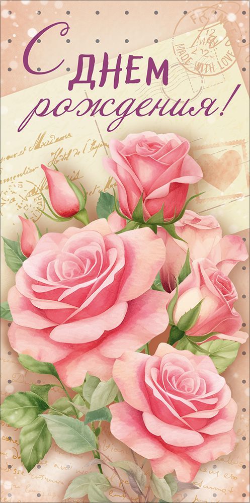 Конверт для денег «С Днем Рождения!» (розовые розы, письмо, штампы)