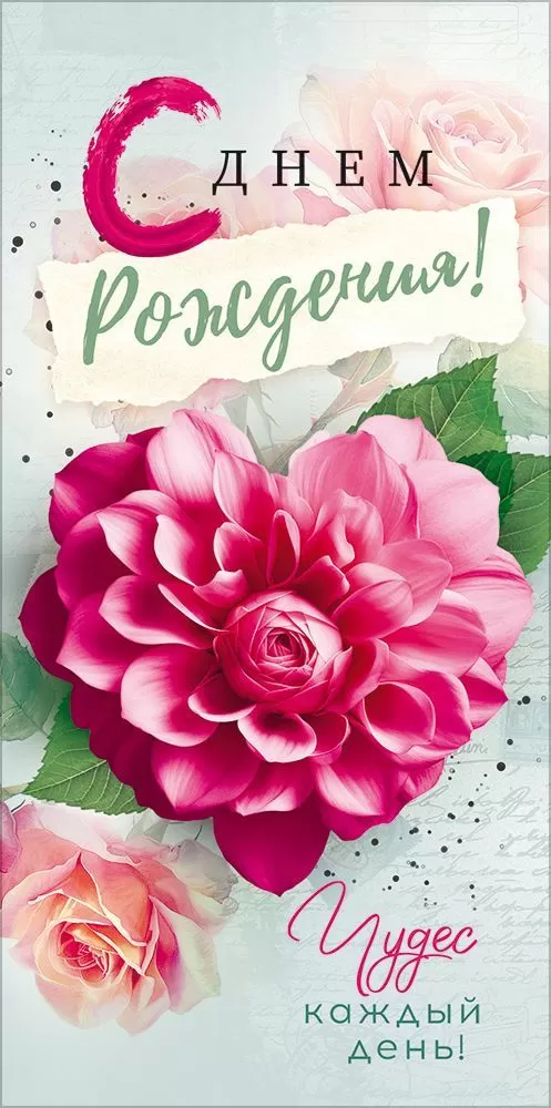 Поздравительный конверт для денег «С Днем рождения! Чудес каждый день» с нежным дизайном преобразит любое торжество. В центре композиции изображен розовый цветок в форме сердца. Его обрамляют зеленые листья. Фон выполнен в элегантном пастельном оттенке, который выгодно контрастирует с цветом бутона. Полупрозрачные розы и каллиграфический текст поддерживают общий стиль. В верхней и нижней частях конверта располагаются поздравительные надписи. Также внутри находится текст с приятными пожеланиями. Данный дизайнерский конверт для денег идеально подойдет в качестве основного подарка или как приятное дополнение к нему. Внутрь можно поместить любую денежную сумму, подарочный сертификат или билеты на концерт. Благодаря прочным материалам производства и качеству печати изделие удобно транспортировать и хранить – оно надолго сохранит свой яркий внешний вид, не помнется и не выцветет, что делает его не только хорошим подарком, но и прекрасным памятным сувениром!