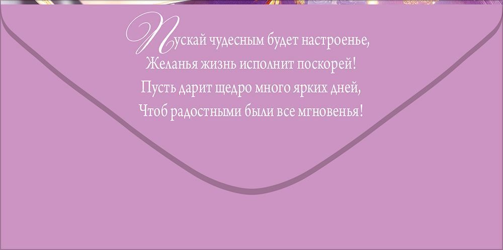 Конверт для денег формата евро изготовлен из плотного картона, что обеспечивает стабильную геометрию изделия и сохранность купюр при хранении и транспортировке. Готовый размер 168 × 84 мм позволяет свободно размещать стандартные денежные купюры, подарочные сертификаты или вложенные мини-открытки без перегибов. Конверт имеет фигурную вырубку, за счет которой лицевая часть образует декоративный край и удобный доступ к вложению, при этом конструкция сохраняет достаточную жесткость и не деформируется при штабелировании. На лицевой стороне размещена полноцветная композиция в розово‑фиолетовой гамме с крупными цветами, декоративной сумочкой и стеклянным яблоком, а также заранее нанесенный текст «Поздравляю!», что делает изделие готовым решением для вручения денежных подарков на дни рождения, юбилеи и другие торжественные события без необходимости дополнительного оформления. Отделка без применения специальных эффектов облегчает хранение крупных партий, снижает риск истирания поверхности при частом пересмотре ассортимента и обеспечивает предсказуемое поведение конверта при изменениях температуры и влажности. Картонная основа совместима с большинством стандартных витринных и складских систем: конверты можно хранить вертикально и горизонтально, формировать устойчивые стопки и транспортировать в коробах без потери товарного вида. Унифицированный дизайн ориентирован на широкий круг получателей и подходит для женской и нейтральной подарочной тематики, что упрощает планирование ассортимента для розничных точек и интернет‑магазинов. Внутреннее пространство рассчитано на размещение как одной, так и нескольких купюр, при этом сгибы и клапаны не создают лишнего объема, что важно при массовой отгрузке и упаковке. В упаковке 10.