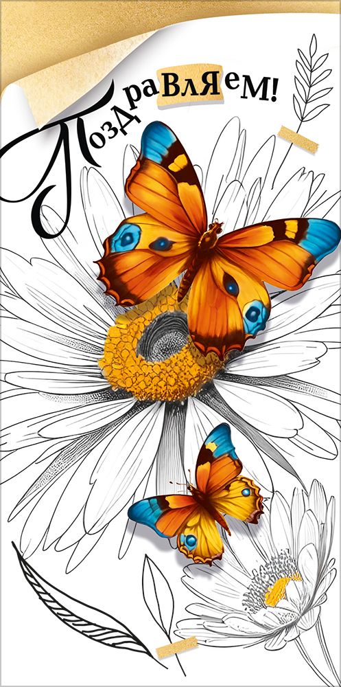 Конверт для денег формата «Евро» предназначен для оформления денежного подарка и включения в состав поздравительных наборов. Изделие изготовлено из плотного картона, что обеспечивает устойчивость к деформации, разрывам и истиранию при транспортировке и хранении, а также сохраняет форму при размещении в витринах и настольных дисплеях. Готовый размер конверта 168 × 84 мм соответствует распространённому формату банкнот и позволяет использовать его с основными валютами без сгибов и заломов. На лицевой стороне размещено полноцветное изображение с крупными яркими бабочками на фоне контурных ромашек и надписью «Поздравляем!», что делает изделие универсальным решением для дня рождения, юбилея, профессионального праздника и других торжественных случаев. Двусторонняя печать обеспечивает законченное визуальное оформление: оборотная сторона также задействована в дизайне, что повышает привлекательность товара при выкладке и позволяет использовать его как самостоятельный подарочный элемент без дополнительной упаковки. Внутри конверта нет текста, что удобно для оптовых покупателей, формирующих ассортимент под разную аудиторию, а также для розничных клиентов, которым требуется возможность вписать индивидуальное поздравление или использовать изделие в корпоративных сценариях. Часть тиража может иметь глянцевое УФ-лаковое покрытие отдельных элементов изображения, что подчёркивает детали рисунка и повышает износостойкость лицевой стороны, другая часть — выполняться без дополнительной отделки, что важно учитывать при формировании полки и ценовых категорий. Конверты поставляются по 10 штук, компактно упакованы, удобны для складского учёта, групповой транспортировки и равномерного пополнения ассортимента в розничных точках.