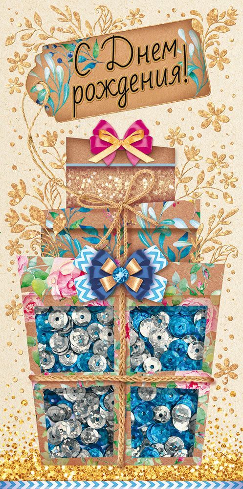 Подарочный конверт изготовлен из плотного картона, пайеток и блесток в лаке. Материал хорошо держит форму и не помнется при транспортировке. Сверху на картонной основе отпечатано красочное полноцветное изображение. На обратной стороне есть теплые пожелания.