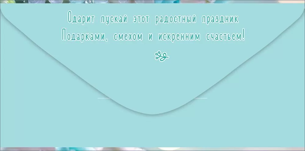 Дизайн выполнен в нежных голубовато-белых оттенках и украшен изображением хрупких цветов, создающих ощущение мягкости и лёгкого праздничного настроения. Композиция смотрится свежо, воздушно и женственно, что делает конверт прекрасным решением для поздравления девушки, коллеги или близкого человека. Конверт выполнен из прочного материала, имеет высокое качество печати и дополнительные инкрустации в виде страз – всё это делает данный конверт отличным памятным сувениром. Во внутренней части напечатаны тёплые пожелания в стихах, которые отлично дополнят вложенную в конверт денежную сумму, подарочный сертификат или билеты на концерт.