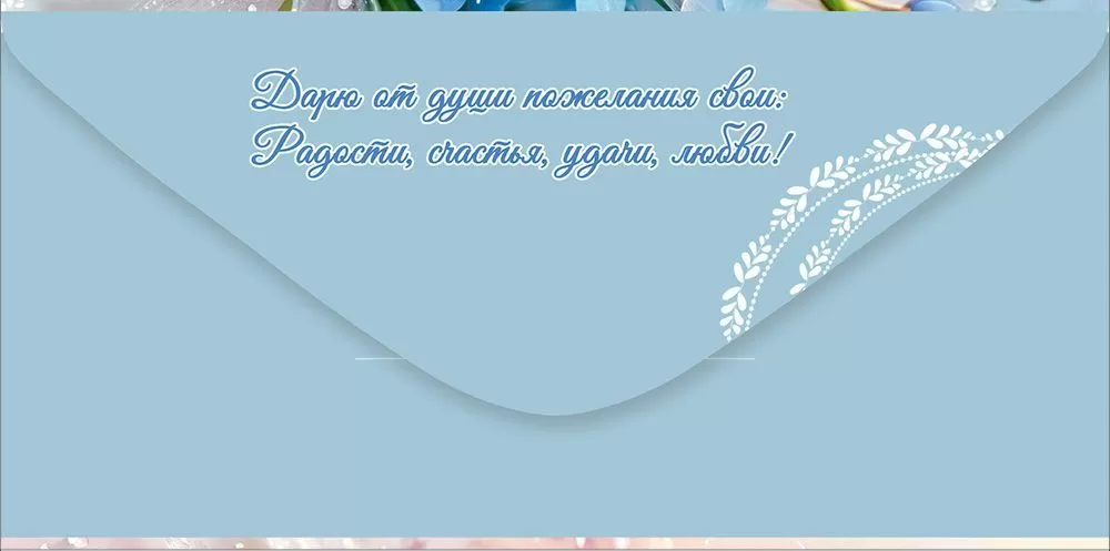 Дизайн выполнен в светлой, воздушной палитре бело-голубых оттенков и украшен изящным букетом голубых цветов. Лёгкие тени и плавные линии создают ощущение чистоты, свежести и праздничной лёгкости. Такой конверт подойдёт для универсального поздравления — будь то день рождения, семейное торжество или любое другое значимое событие. Конверт выполнен из прочного материала, имеет высокое качество печати и отделку в виде сияющих блёсток в лаке, предупреждающем их обсыпание или отслаивание – всё это делает данный конверт отличным памятным сувениром. Во внутренней части напечатаны тёплые пожелания в стихах, которые отлично дополнят вложенную в конверт денежную сумму, подарочный сертификат или билеты на концерт.
