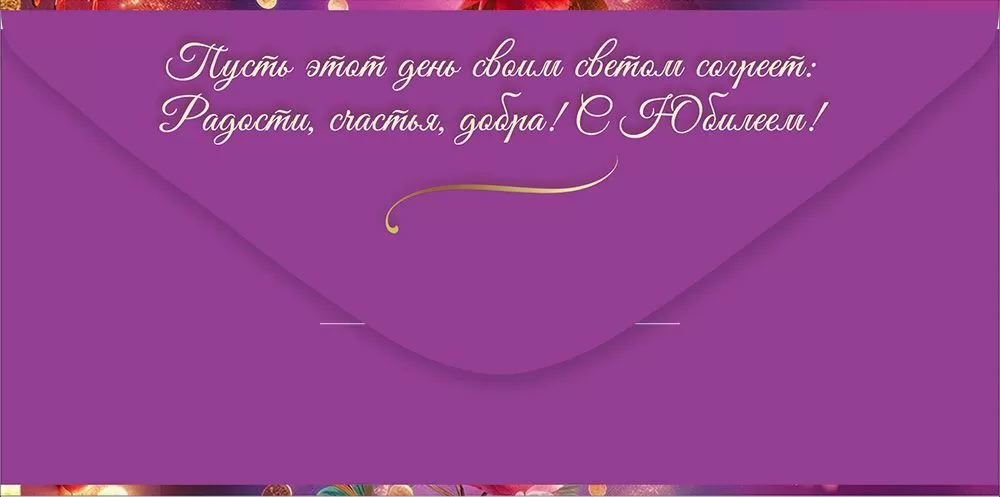 Дизайн выполнен в насыщенной фиолетово-розовой гамме и украшен изображением роскошного букета пионов, помещённого в стеклянную вазу с мягкими отсветами. Композиция выглядит утончённо, элегантно и по вечернему ярко. Конверт выполнен из прочного материала, имеет высокое качество печати и отделку в виде сияющих блёсток в лаке, предупреждающем их обсыпание или отслаивание – всё это делает данный конверт отличным памятным сувениром. Во внутренней части напечатаны тёплые пожелания в стихах, которые отлично дополнят вложенную в конверт денежную сумму, подарочный сертификат или билеты на концерт.