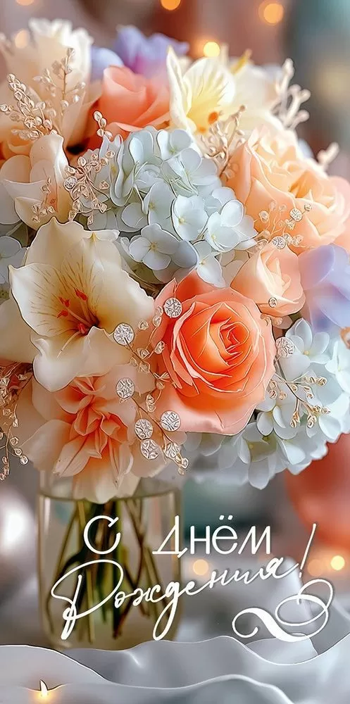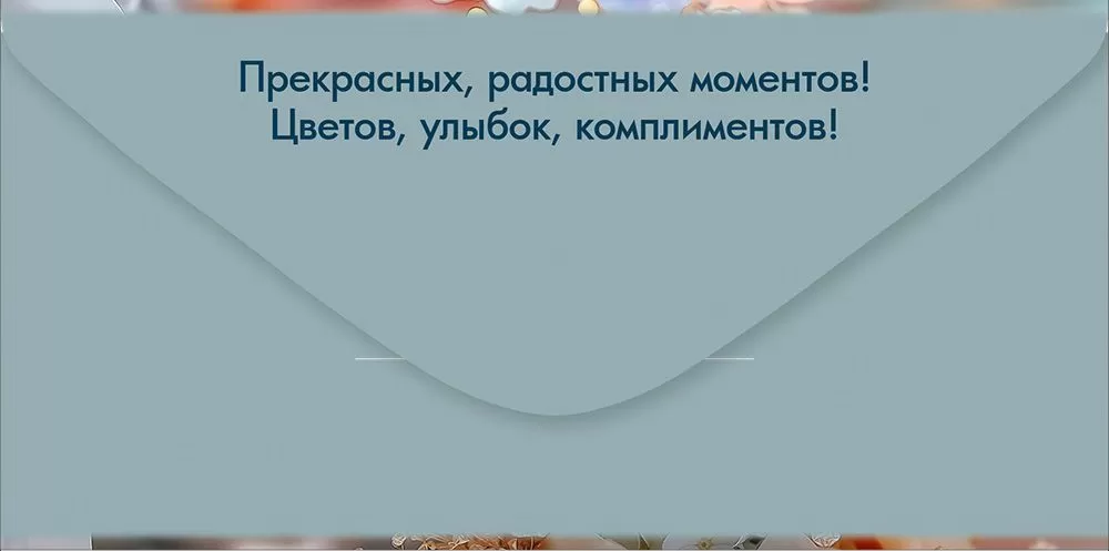 Дизайн оформлен в светлой пастельной гамме с оттенками персикового, белого и голубого. На обложке изображён изысканный букет цветов, создающий атмосферу свежести, мягкости и торжества. Такой конверт идеально подойдёт для поздравления женщины, девушки, коллеги или родственницы. Конверт выполнен из прочного материала, имеет высокое качество печати и отделку в виде сияющих блёсток в лаке, предупреждающем их обсыпание или отслаивание – всё это делает данный конверт отличным памятным сувениром. Во внутренней части напечатаны тёплые пожелания в стихах, которые отлично дополнят вложенную в конверт денежную сумму, подарочный сертификат или билеты на концерт.