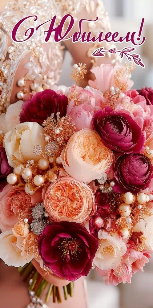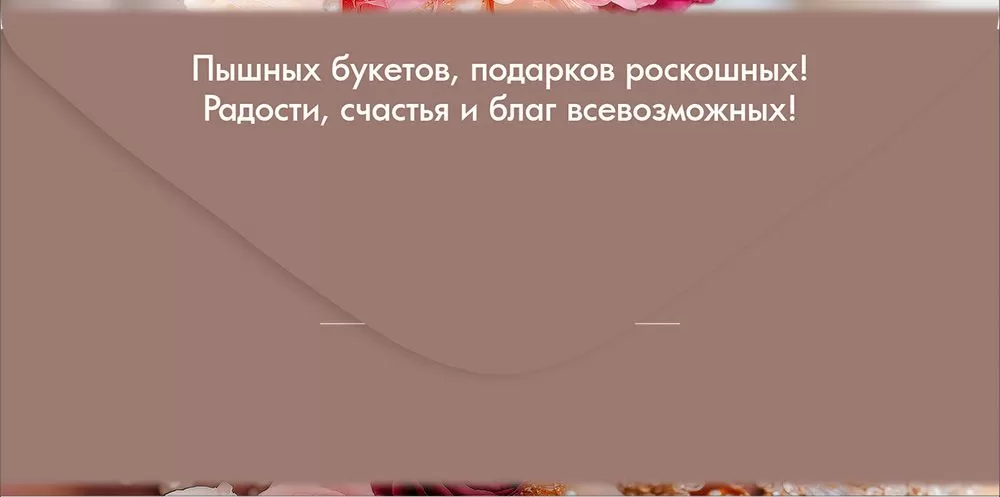 На обложке размещена стильная цветочная композиция в розово-бордовых оттенках, дополненная художественными декоративными элементами в виде жемчужных бусин. Дизайн выглядит роскошно, элегантно и празднично, что делает этот конверт удачным решением для значимого юбилея. Конверт выполнен из прочного материала, имеет высокое качество печати и отделку в виде сияющих блёсток в лаке, предупреждающем их обсыпание или отслаивание – всё это делает данный конверт отличным памятным сувениром. Во внутренней части напечатаны тёплые пожелания в стихах, которые отлично дополнят вложенную в конверт денежную сумму, подарочный сертификат или билеты на концерт.