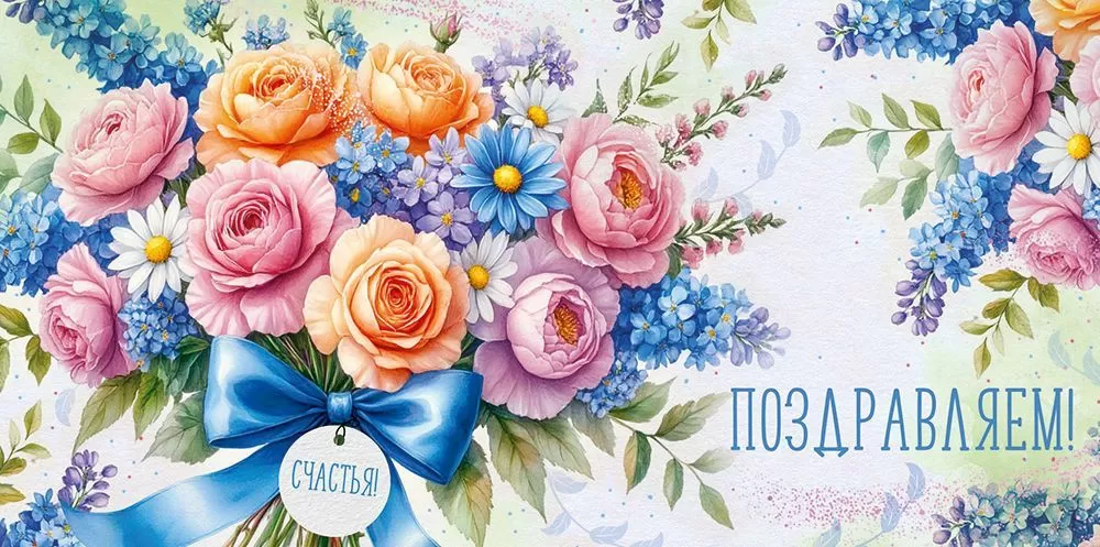 Поздравительный конверт для денег «Поздравляем!» с чудесным дизайном преобразит любое торжество. Ярким акцентом композиции является пестрый букет, перевязанный синей атласной лентой. Изображения в стиле акварельного рисунка придают конверту оригинальности и делают его незабываемым. Насыщенные, но очень мягкие оттенки составляют приятную летнюю гамму, которая поможет создать праздничное настроение. Также внутри находится текст с приятными пожеланиями. Данный дизайнерский конверт для денег идеально подойдет в качестве основного подарка или как приятное дополнение к нему. Внутрь можно поместить любую денежную сумму, подарочный сертификат или билеты на концерт. Благодаря прочным материалам производства и качеству печати изделие удобно транспортировать и хранить – оно надолго сохранит свой яркий внешний вид, не помнется и не выцветет, что делает его не только хорошим подарком, но и прекрасным памятным сувениром!