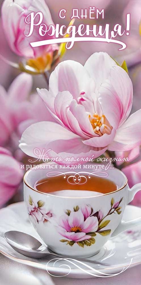 Конверт для денег «С Днём рождения!» (чашка с чаем на блюдце, ложка, крупный розовый цветок)