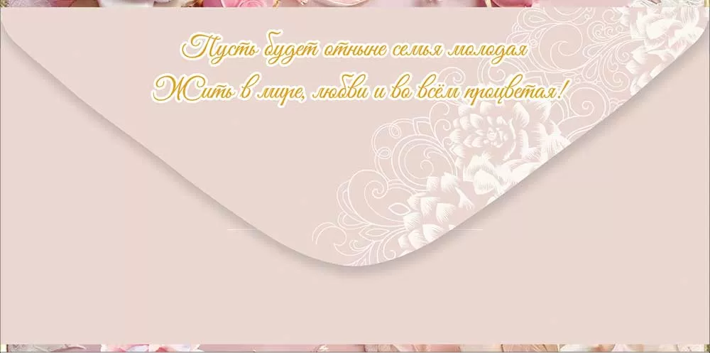 Поздравительный конверт для денег «С Днём Свадьбы!» преобразит любое торжество! Изделие выполнено в нежной светло-розовой цветовой гамме с изображением нежных цветов и резных элементов, добавляющих композиции визуального объем. Нейтральный однотонный фон поможет сконцентрировать внимание на поздравительной надписи и сделает оформление более лаконичным и элегантным. Изделие выполнено из прочного материала, имеет высокое качество печати и дополнительные инкрустации в виде радужных блесток в лаке, предупреждая их обсыпание или отслаивание – всё это делает данный конверт отличным памятным сувениром. Во внутренней части напечатаны пожелания в стихах, которые отлично дополнят вложенную в него денежную сумму, подарочный сертификат или билеты на концерт.