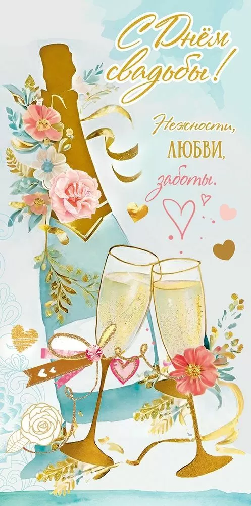 Конверт для денег «С Днём свадьбы! Нежности, любви, заботы.» (бутылка шампанского и два бокала)