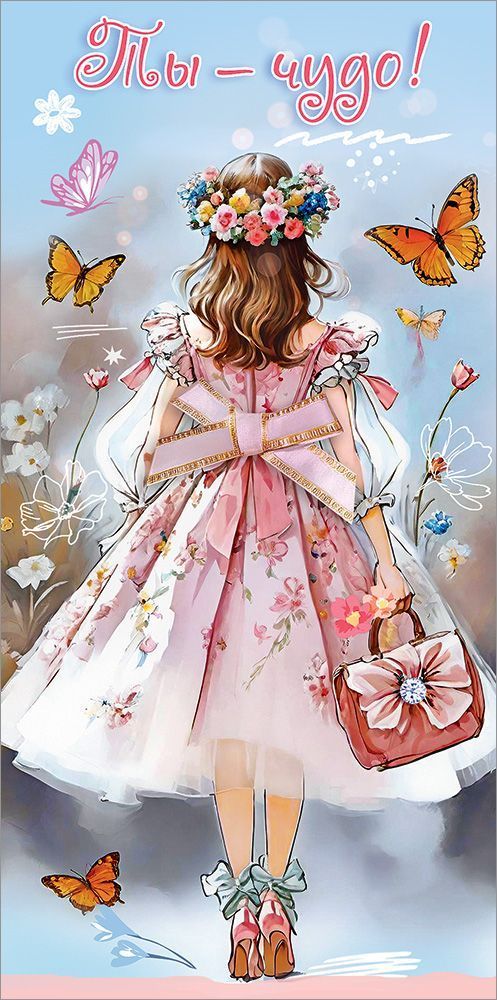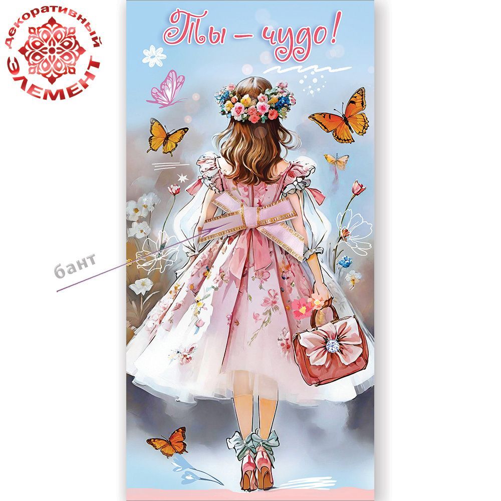 Конверт для денег «Ты - чудо!» (девочка спиной с венком, бантом и сумкой, бабочки)