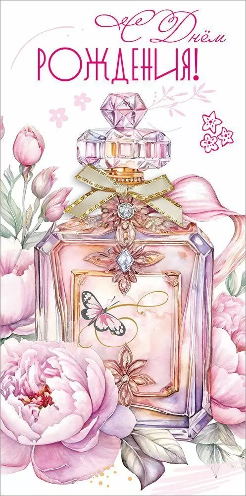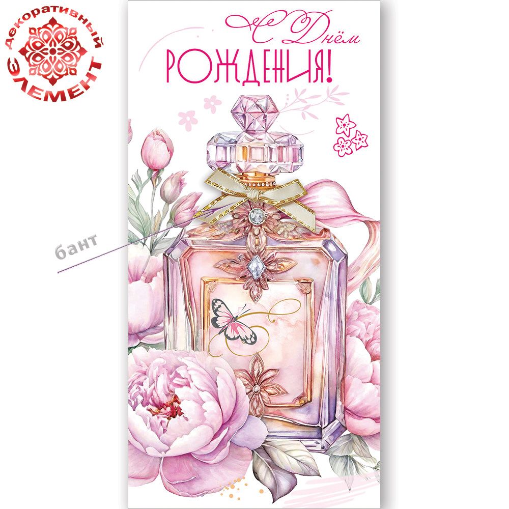 Конверт для денег «С Днём рождения!» (флакон духов с бантом, пионы, бабочка)