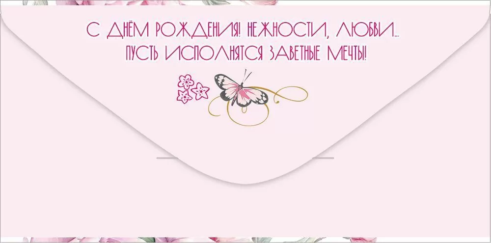 Иллюстрация выполнена в изысканном стиле: композиция из пудровых цветов, элегантного флакона духов и тонких графичных деталей создаёт атмосферу утончённости и женственности. Такой дизайн подчеркнёт хороший вкус и станет прекрасным выбором для ценительниц красоты и гармонии. Конверт выполнен из прочного материала, имеет высокое качество печати и дополнительную фурнитуру в виде атласного бантика – все это делает данный конверт отличным памятным сувениром. Во внутренней части напечатаны приятные пожелания в стихах, которые отлично дополнят вложенную в конверт денежную сумму, подарочный сертификат или билеты на концерт.