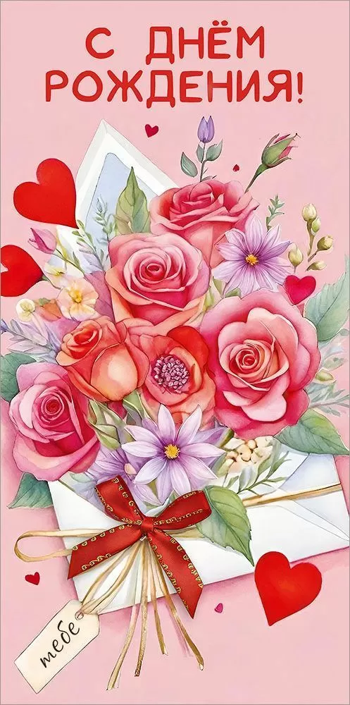 Дизайн оформлен в мягких розово-кремовых тонах и украшен роскошным букетом роз, дополненным небольшими сердечками и тонкой декоративной лентой. Композиция создаёт ощущение тепла, заботы и искренних чувств — идеальный вариант для близкого человека. Конверт выполнен из прочного материала, имеет высокое качество печати и дополнительную фурнитуру в виде атласного бантика – все это делает данный конверт отличным памятным сувениром. Во внутренней части напечатаны приятные пожелания в стихах, которые отлично дополнят вложенную в конверт денежную сумму, подарочный сертификат или билеты на концерт.