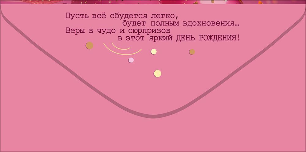 Конверт для денег формата «Евро» предназначен для оформления и вручения денежного подарка на день рождения. Изделие выполнено из плотного картона, что обеспечивает устойчивость к деформации при транспортировке и хранении, а также аккуратный внешний вид при многократных перекладках в коробах и лотках. Готовый размер конверта 168 × 84 мм позволяет размещать внутри стандартные купюры без сгибов и заломов, что важно как для розничного покупателя, так и для оптового заказчика при формировании универсального ассортимента. Лицевая сторона оформлена изображением воздушных шаров в розово‑золотой гамме с декоративными элементами, дополнена поздравительным текстом по тематике дня рождения и пожеланием исполнения желаний; внутренний разворот также предусматривает текстовое наполнение и свободное поле для личной подписи. Отделка выполнена с использованием золотых блесток в лаке, создающих выразительный мерцающий эффект и устойчивых к осыпанию при стандартных условиях эксплуатации, что снижает риск брака при массовой выкладке и пересортице. Фигурная вырубка придаёт изделию аккуратный контур и облегчает открывание, при этом края ровные, без заусенцев, что удобно при машинной и ручной упаковке. Конверт рассчитан на использование в розничных магазинах подарочной и канцелярской продукции, цветочных салонах, отделах праздничной упаковки, а также в корпоративных закупках для поздравления сотрудников и партнёров. Плотный картон сохраняет форму при размещении в витринных кассетах и настольных стойках, конверты можно хранить стопами без риска сминания. Упаковка содержит 10 изделий, что удобно для планирования складских остатков и пополнения полки кратными партиями. Универсальный праздничный дизайн подходит для широкого круга получателей, что позволяет использовать данный конверт как стабильную позицию постоянного ассортимента.