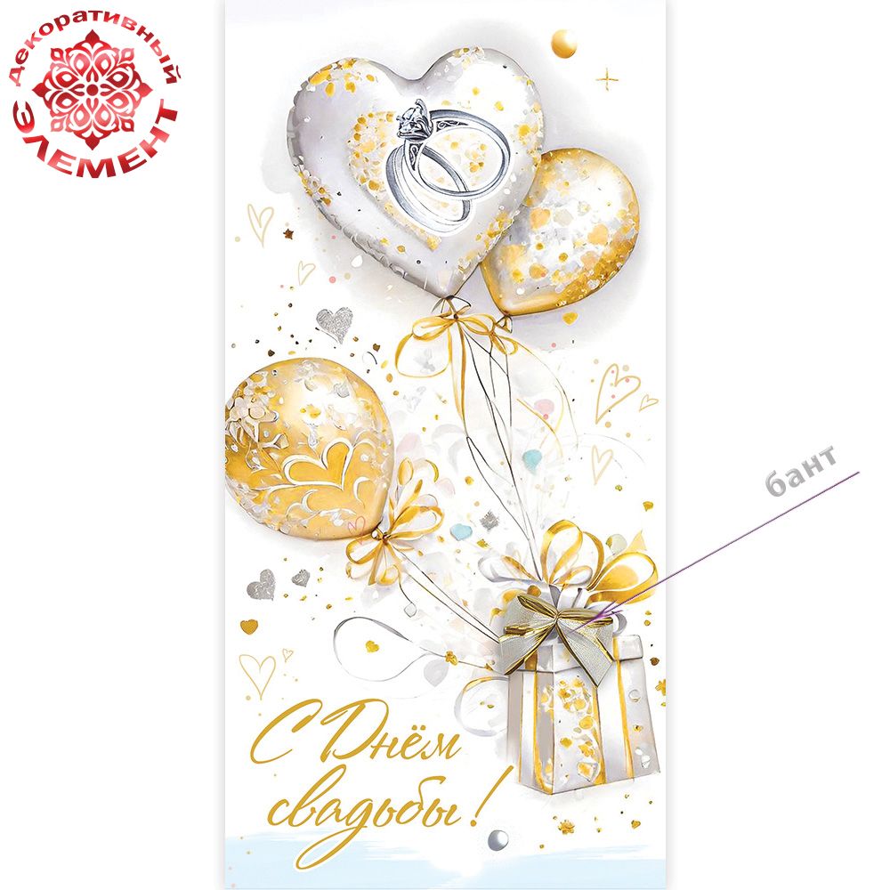 Конверт для денег «С Днём свадьбы!» (коробка с бантом и шарами, кольца на шаре-сердечке)
