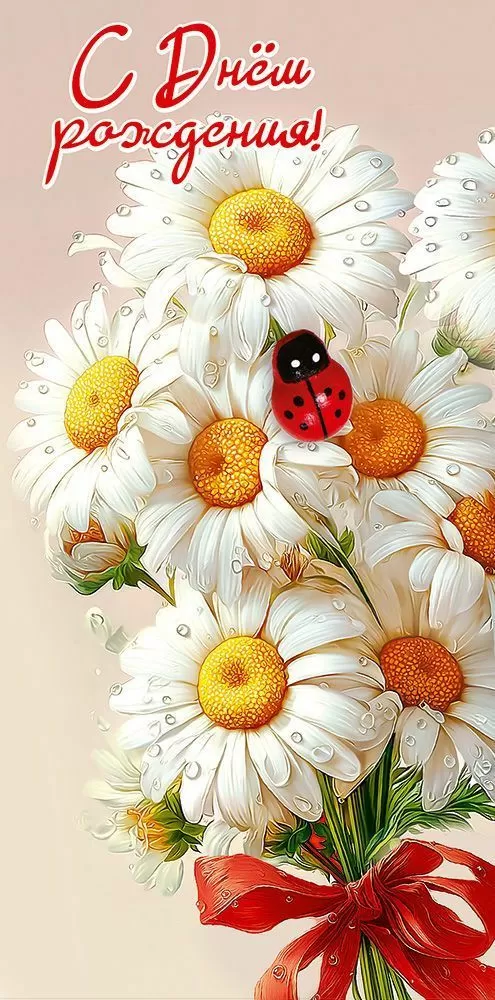 Конверт для денег «С Днём рождения!» (букет ромашек с бантом и божьей коровкой)