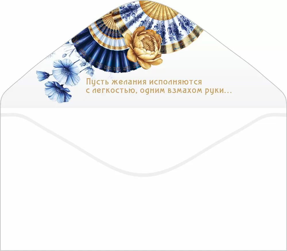 Стильный конверт для денег с надписью «С юбилеем!» идеально подходит в качестве подарка или дополнения к подарку. Конверт из дизайнерского картона украшен яркой иллюстрацией и выглядит очень эффектно! На конверте изображены раскрытые сине-белые веера и золотые цветы. На внутреннем клапане написано небольшое пожелание. Размеры – 168х84 мм. На нашем сайте можно заказать конверты для денег оптом. В одной упаковке 10 шт.