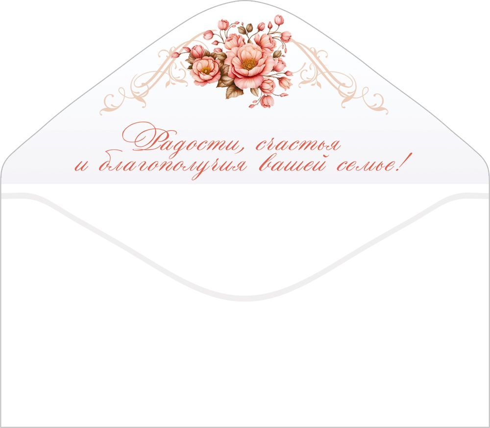Конверт для денег формата евро предназначен для оформления денежного подарка к свадьбе и рассчитан на использование в розничной продаже и оптовых поставках для магазинов подарочной и канцелярской группы, цветочных салонов и праздничных агентств. Изделие изготовлено из плотного дизайнерского картона, что обеспечивает устойчивость к деформации, аккуратный внешний вид при хранении и транспортировке, а также достаточную жесткость для безопасного вложения купюр и поздравительной записки. Лицевая сторона оформлена двусторонним изображением с тематикой свадебного торжества: композиция из розово-персиковых цветов, обручальные кольца, декоративные элементы и надпись «С Днем свадьбы!», выполненная с применением золотой фольги. Фольгирование придает надписям и отдельным деталям устойчивый металлический блеск, повышает износостойкость печати и делает изделие более заметным на витрине. Внутри размещен печатный поздравительный текст, позволяющий использовать конверт как самостоятельное поздравление без дополнительной открытки; при необходимости остается место для краткого личного обращения и подписи. Размер готового изделия 168 × 84 мм соответствует стандартному евроформату, что упрощает выкладку в торговом оборудовании, группировку по сериям и хранение в коробах или лотках, а также обеспечивает совместимость с большинством купюр, складываемых один раз. Конверт рассчитан на использование в вертикальных и горизонтальных витринах, не требует индивидуальной дополнительной упаковки и может продаваться как поштучно, так и блоками по 10. Плотный картон сохраняет форму при пересылке и вручении, не просвечивает содержимое и обеспечивает аккуратный внешний вид денежного подарка на свадебной церемонии, в ресторане или при домашнем поздравлении. Дизайн и нейтральный текст ориентированы на широкий круг дарителей и подходят для использования как частными покупателями, так и корпоративными клиентами при поздравлении сотрудников и партнеров.