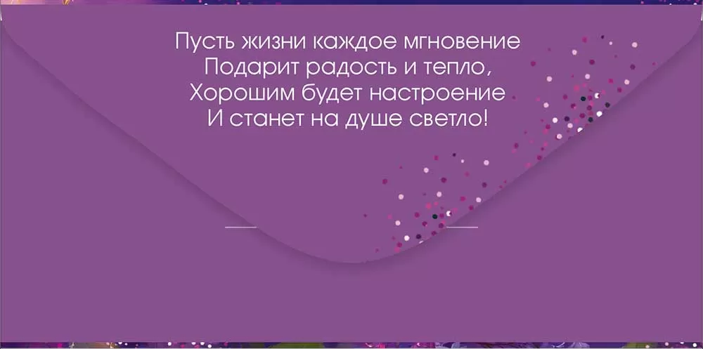Стильный конверт для денег с надписью «С днем рождения!» идеально подходит в качестве подарка или дополнения к подарку. Конверт украшен яркой иллюстрацией, четкое полноцветное изображение покрыто глянцевым ВД-лаком. На конверте изображены розы, сирень и бабочки, волшебно светящиеся на фоне мягкого фиолетового вечера. На внутреннем клапане написано небольшое пожелание. Размеры – 168х84 мм. На нашем сайте можно заказать конверты для денег оптом. В одной упаковке 10 шт.