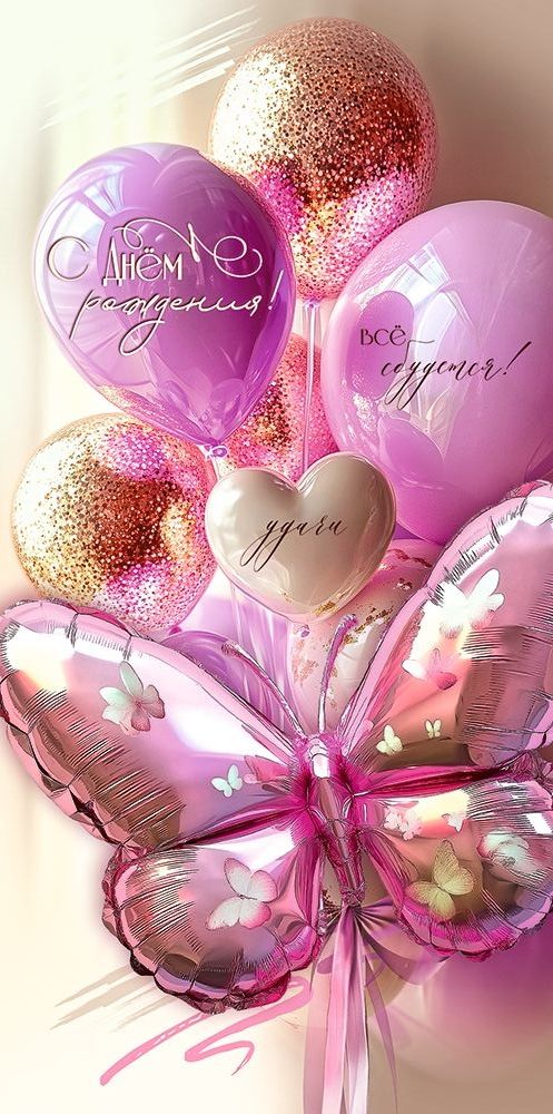 Конверт для денег «С Днём рождения! Всё сбудется! Удачи» (воздушные шары розово-золотистые, шар-бабочка)