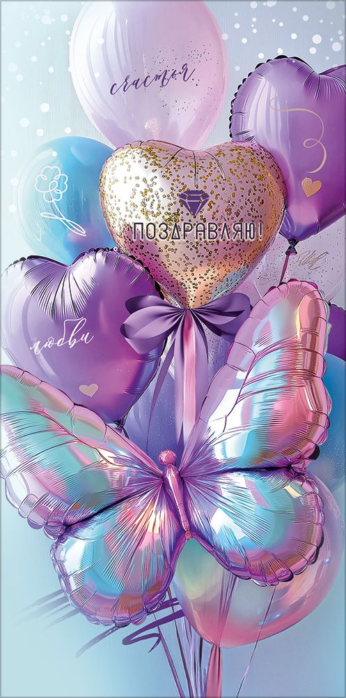 Конверт для денег формата «Евро» изготовлен из плотного картона и рассчитан на размещение стандартных купюр без сгиба, что удобно как при розничной покупке единичных экземпляров, так и при формировании оптового ассортимента. Готовое изделие имеет размеры 168 × 84 мм, что обеспечивает совместимость с большинством стандартных подарочных вложений и удобство хранения в лотках и стеллажах. Конверт выполнен с фигурной вырубкой, за счёт которой контур изделия визуально поддерживает основную композицию с крупной радужной бабочкой и группой воздушных шаров в форме сердца и классических шаров. Лицевая сторона содержит поздравительный текст «Поздравляю!» и дополнительные надписи тематического характера, что позволяет использовать изделие для широкого круга торжеств: дня рождения, юбилеев, личных и семейных праздников, поощрений и корпоративных поздравлений. В оформлении применена отделка с радужными блестками в лаке, создающая мерцающий эффект на отдельных элементах изображения и повышающая износостойкость печати за счёт защитного лаковго слоя. Материал картона подобран таким образом, чтобы конверт сохранял форму при транспортировке, не деформировался при кратковременном механическом воздействии и выдерживал стандартные условия складского хранения без потери внешнего вида. Конструкция предусматривает привычный способ закладки денежных купюр и возможных дополнительных вложений, например, небольших плоских открыток или визиток, при этом края аккуратно подогнаны и не мнут содержимое. Цветовое решение с преобладанием сиреневых, розовых и голубых оттенков, а также глянцевый эффект отдельных зон делают конверт универсальным подарочным решением для взрослых и подростков. В одной упаковке поставляется 10 изделий, что удобно для планирования закупок, формирования витрины и последующей продажи поштучно или комплектами.