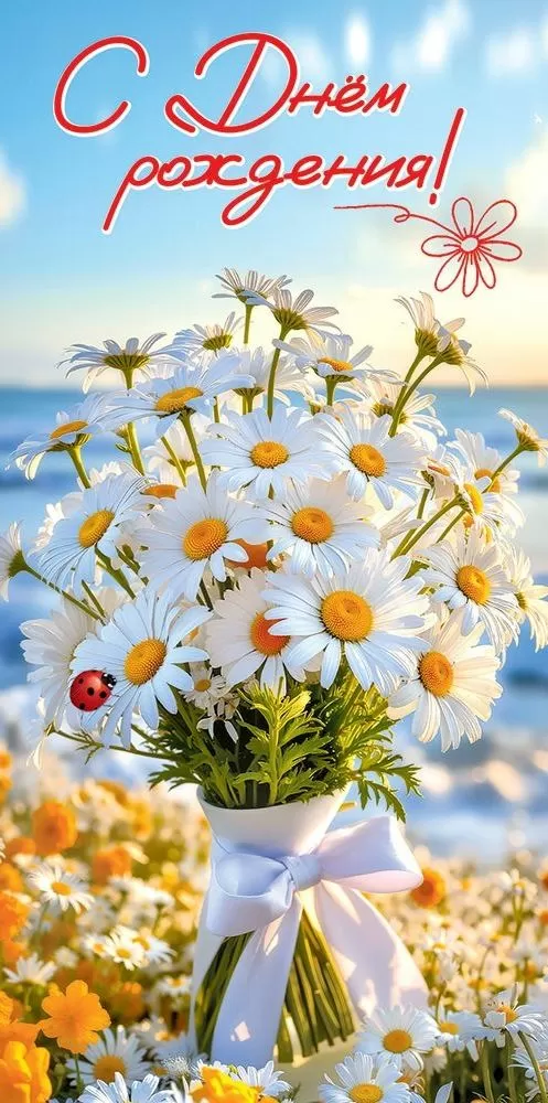 Конверт для денег «С Днём рождения!» (букет ромашек с белой лентой и божьей коровкой на цветочной поляне)