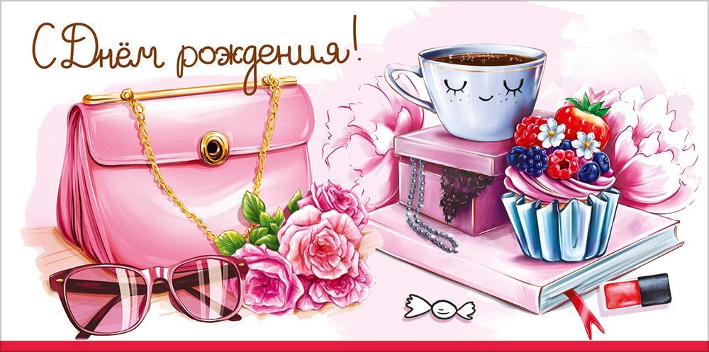Конверт для денег «С Днём рождения!» (сумочка, очки, букет, чашка, шкатулка, пирожное с ягодами, книга, помада)