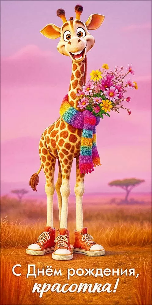 Конверт для денег «С Днём рождения, красотка!» (жираф с кедах и шарфе с букетом)