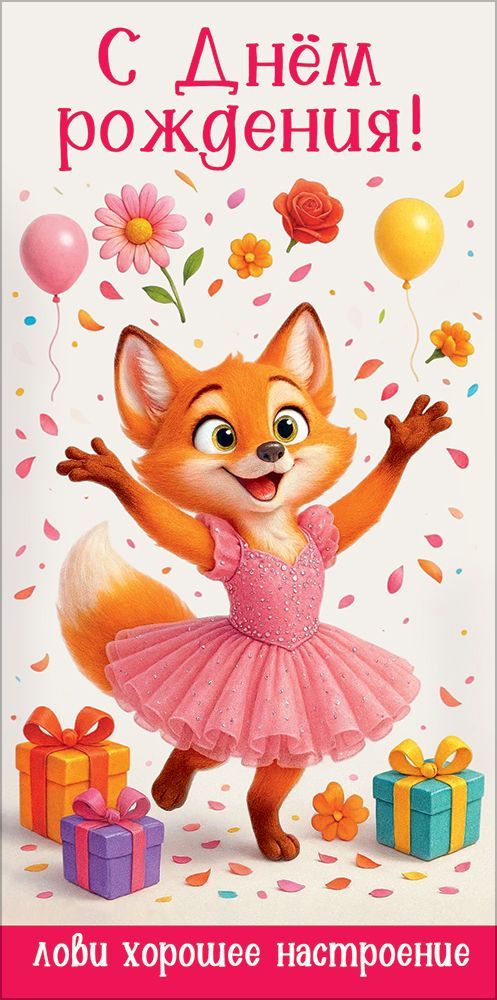 Конверт для денег «С Днём рождения! Лови хорошее настроение» (лиса в платье, подарки, цветы, шарики)