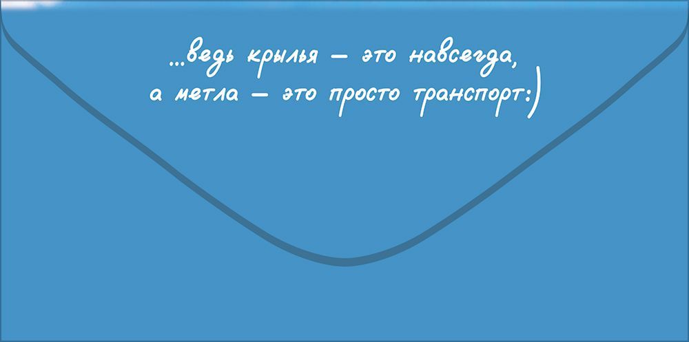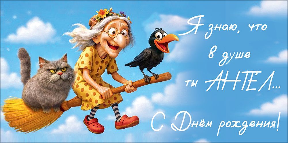Конверт для денег «Я знаю, что в душе ты АНГЕЛ... С Днём рождения!» (баба-яга на метле с котом и вороной)