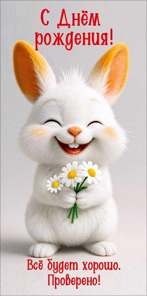 Конверт для денег «С Днём рождения! Всё будет хорошо. Проверено!» (улыбающийся заяц с ромашками в лапах)
