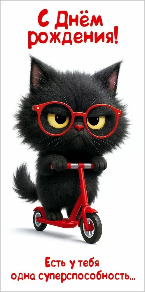 Конверт для денег «С Днём рождения! Есть у тебя одна суперспособность...» (чёрный котёнок в очках на самокате)