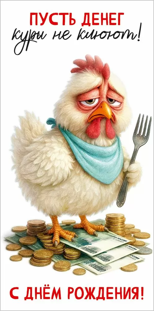 Конверт для денег «Пусть денег куры не клюют! С Днём рождения!» (грустная курица с вилкой стоит на монетах и купюрах)