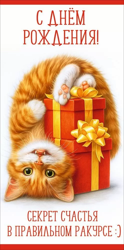 Конверт для денег «С Днём рождения! Секрет счастья в правильном ракурсе:)» (рыжий кот с подарками)
