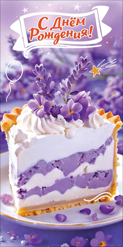 Конверт для денег «С Днём рождения!» (кусок торта с цветами и лепестками на тарелке)