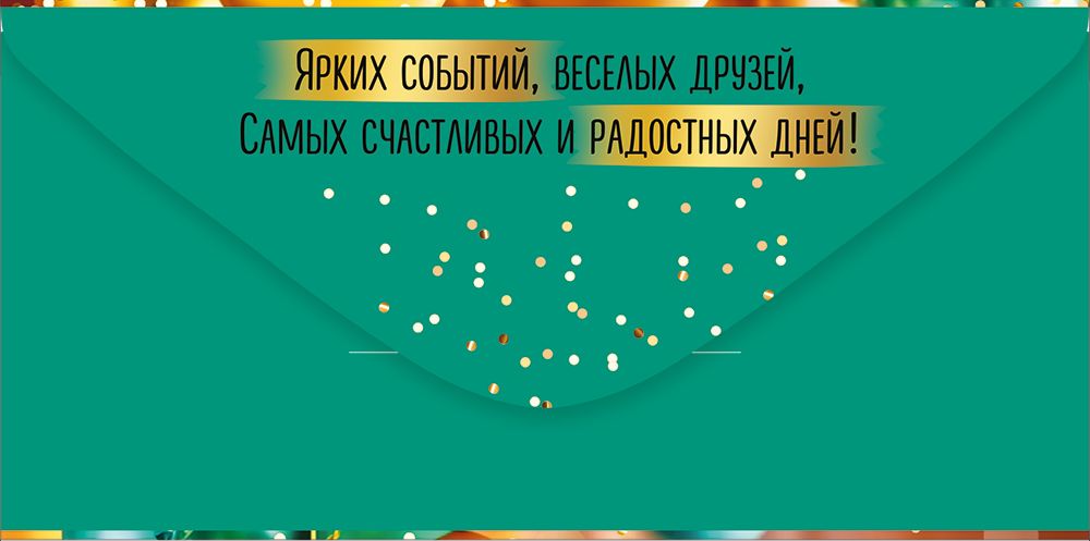 Стильный конверт для денег с надписью «С днем рождения!» идеально подходит в качестве подарка или дополнения к подарку. Конверт украшен яркой иллюстрацией, четкое полноцветное изображение покрыто глянцевым УФ-лаком. На конверте изображены золотые и зеленые воздушные шары. На внутреннем клапане написано небольшое пожелание. Размеры – 168х84 мм. На нашем сайте можно заказать конверты для денег оптом. В одной упаковке 10 шт.