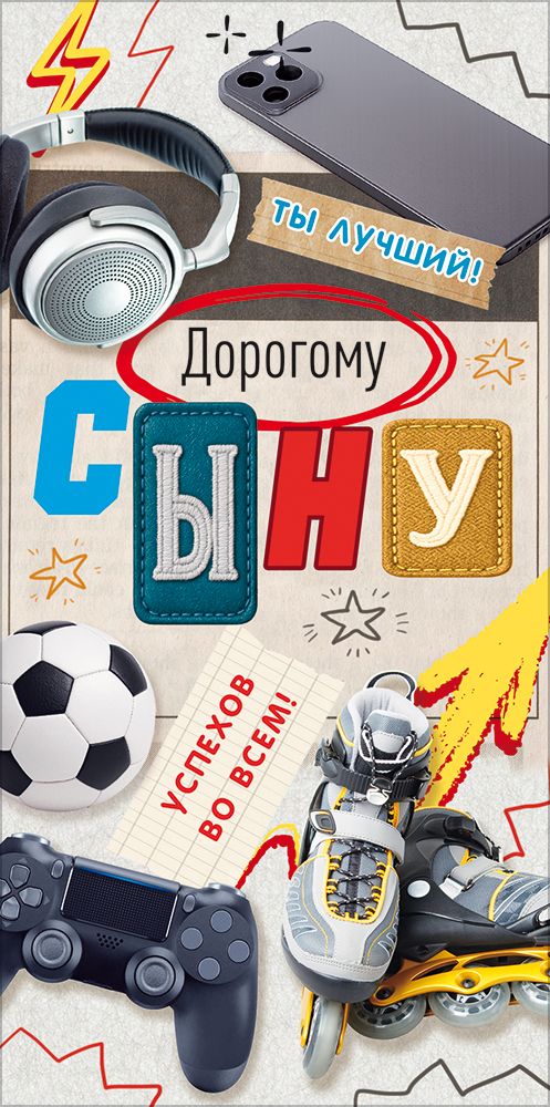 Конверт для денег «Дорогому сыну» (ролики, смартфон, мяч, джойстик, наушники)