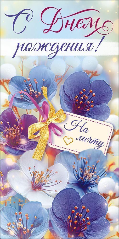 Конверт для денег «С Днем Рождения!» (синие цветы, бирка с бантом)