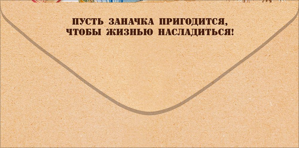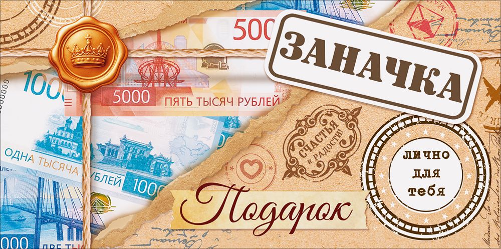 Стильный конверт для денег с надписью «Заначка» идеально подходит в качестве подарка или дополнения к подарку. Конверт изготовлен из крафт-картона и украшен иллюстрацией с отделкой белилами. Дизайн конверта сделан в виде бандероли, перевязанной бечевкой и запечатанной сургучной печатью с короной. На конверте стоят штампы и надписи: "Лично для тебя", "Счастья и радости!", "Подарок". Часть упаковки будто бы порвана и видно, что внутри лежат купюры разного достоинства. На внутреннем клапане есть небольшое пожелание. Размеры – 168х84 мм. На нашем сайте можно заказать конверты для денег оптом. В одной упаковке 10 шт.