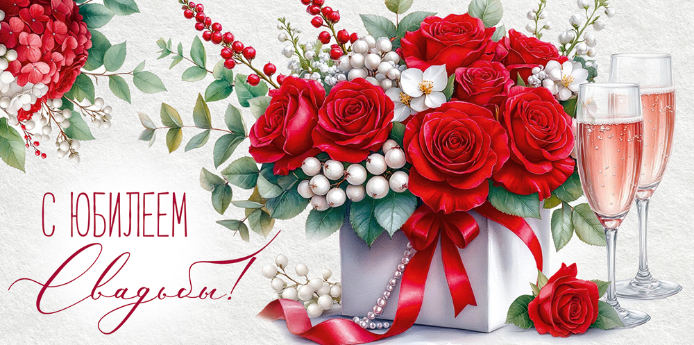 Конверт для денег «С юбилеем свадьбы!» (цветы, бокалы)