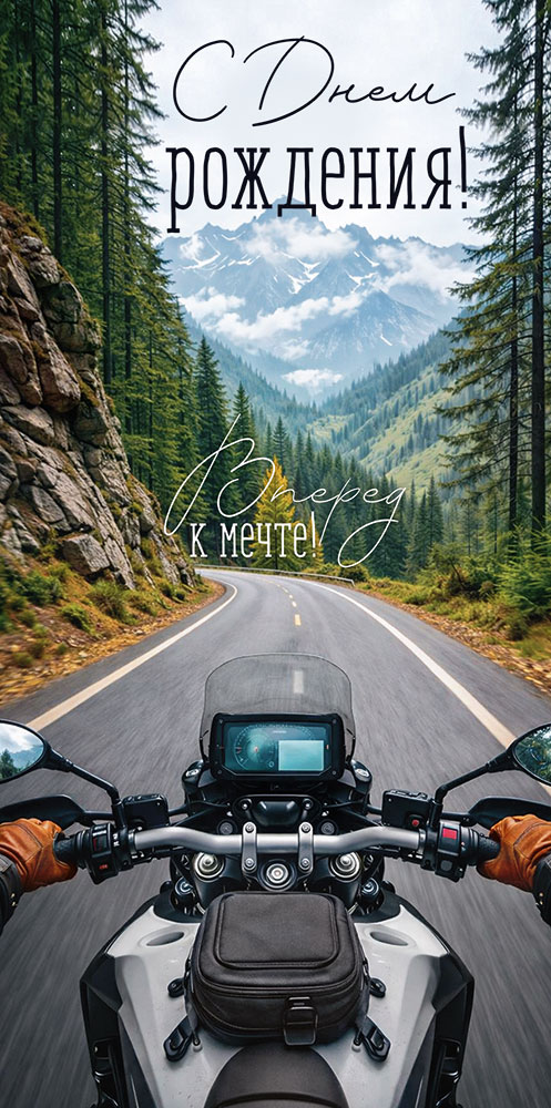 Поздравительный конверт для денег «С Днем рождения! Вперед к мечте!» с динамичным и стильным дизайном преобразит любое торжество. Изделие изображает воодушевляющий вид на горы, покрытые хвойным лесом и туманом. Асфальтная дорога ведет куда-то вперед и заворачивает за скалистый выступ. В нижней части конверта изображены руль и приборная панель мотоцикла. Такой сюжет символизирует движение к цели, стремление к успехам и достижениям. Также внутри находится текст с приятными пожеланиями. Данный дизайнерский конверт для денег идеально подойдет в качестве основного подарка или как приятное дополнение к нему. Внутрь можно поместить любую денежную сумму, подарочный сертификат или билеты на концерт. Благодаря прочным материалам производства и качеству печати изделие удобно транспортировать и хранить – оно надолго сохранит свой яркий внешний вид, не помнется и не выцветет, что делает его не только хорошим подарком, но и прекрасным памятным сувениром!