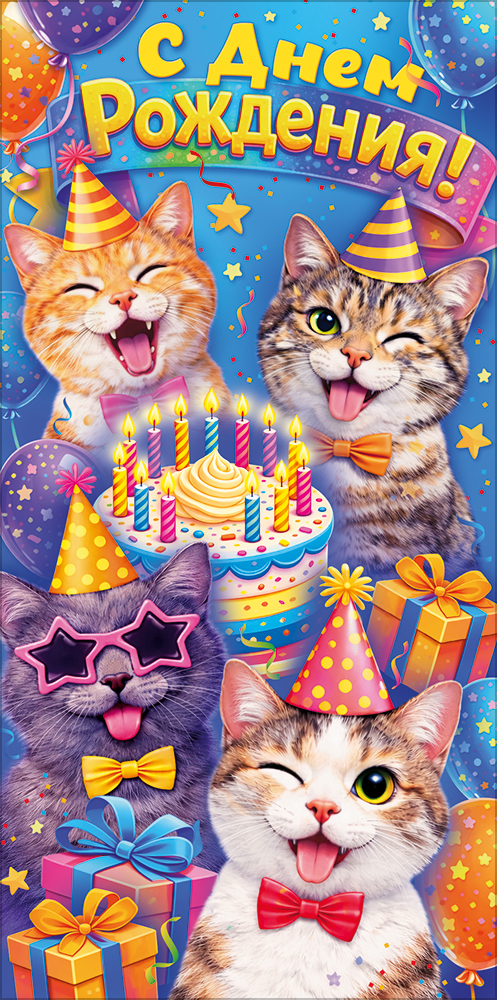 Конверт для денег "С Днем Рождения!" (коты, торт, шары, подарки)