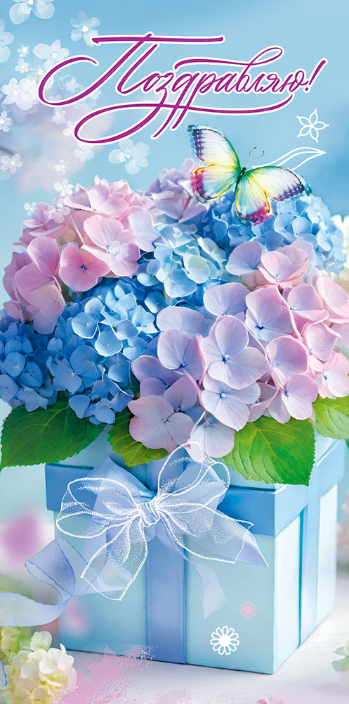 Конверт для денег "Поздравляю!" (букет гортензий на коробке с бантом, бабочка)