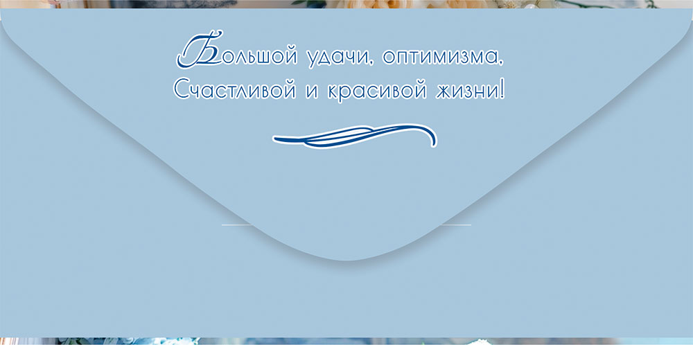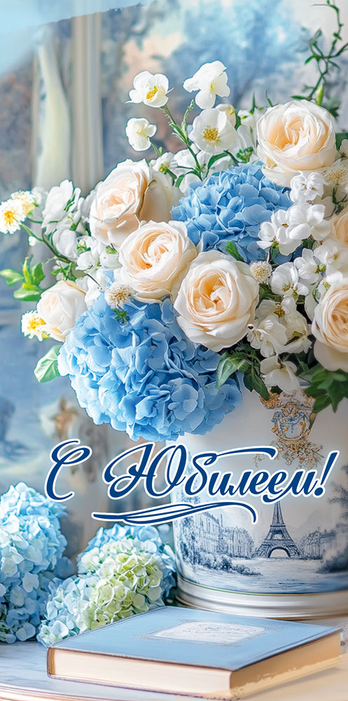 Конверт для денег "С Юбилеем!" (букет из белых и голубых цветов в ведёрке, рядом книга)