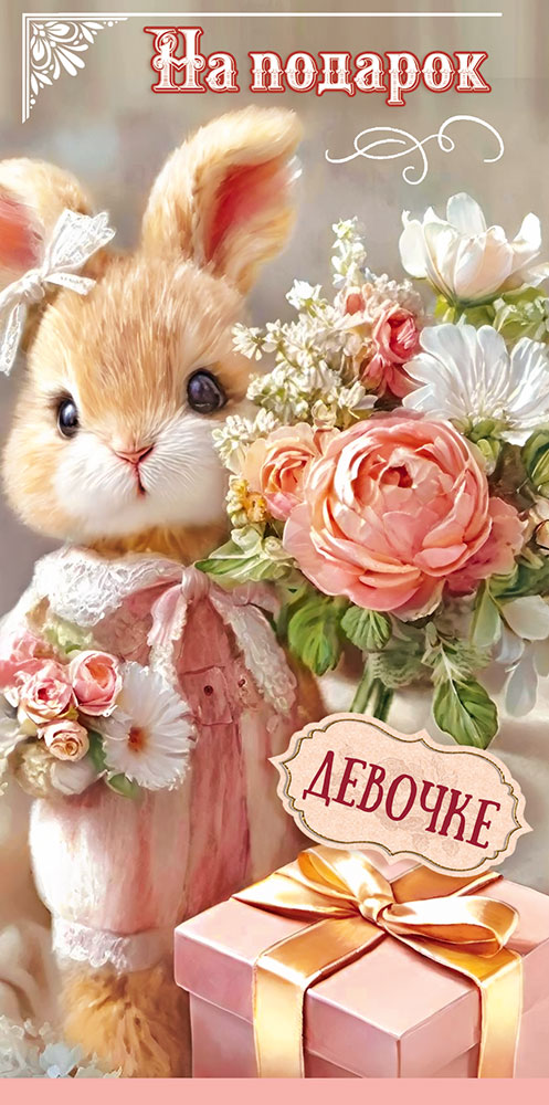 Конверт для денег "На подарок девочке" (зайка в комбинезоне с подарком и букетами)