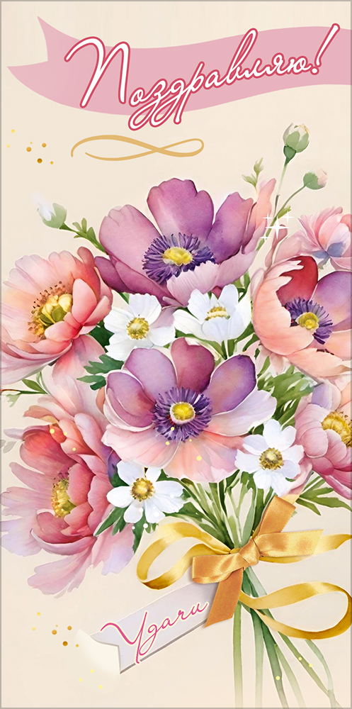 Конверт для денег "Поздравляю! Удачи" (букет из разных цветов с бантиком)