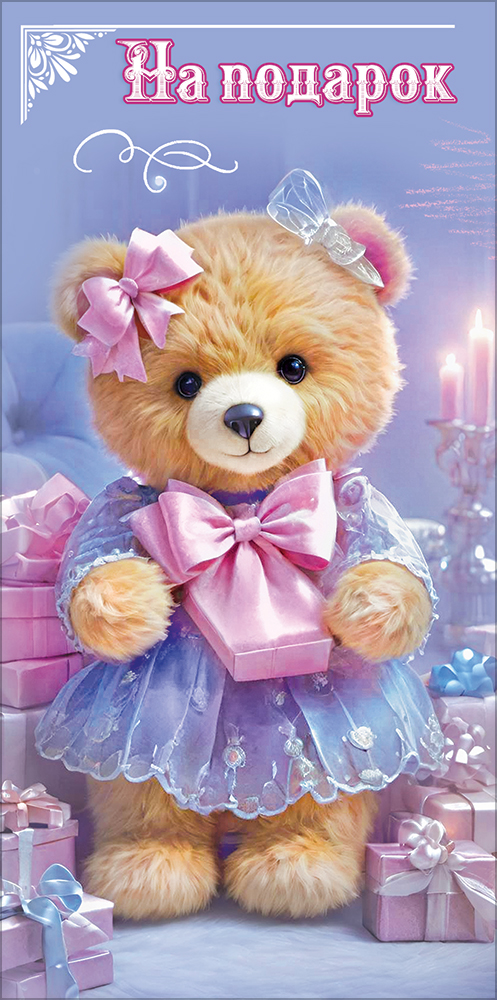 Конверт для денег "На подарок" (медвежонок с бантиками в платье среди подарков)