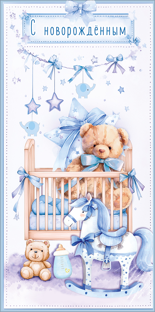 Конверт для денег "С новорождённым" (мишка с бантом в детской кроватке среди игрушек)